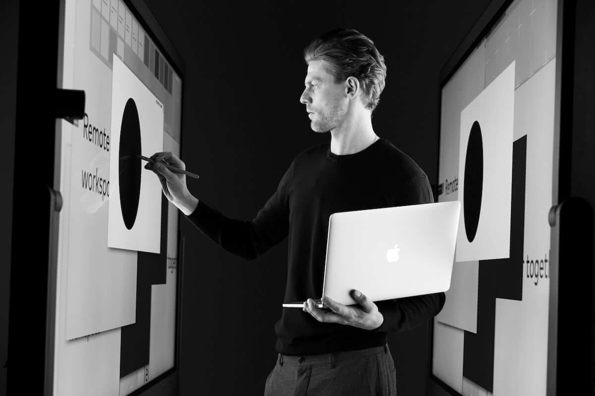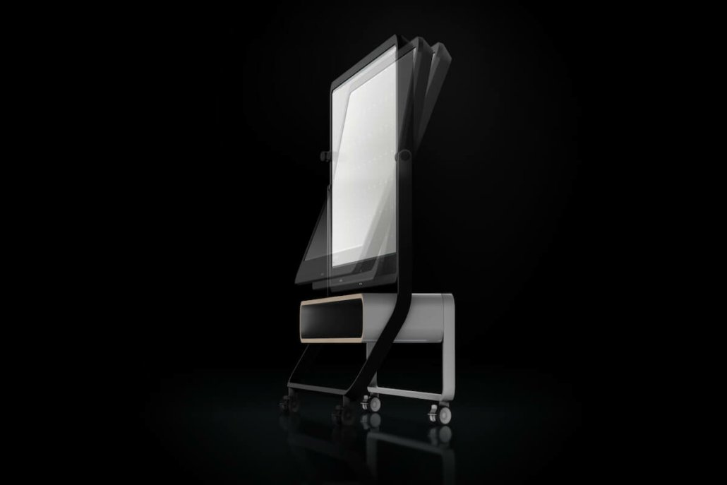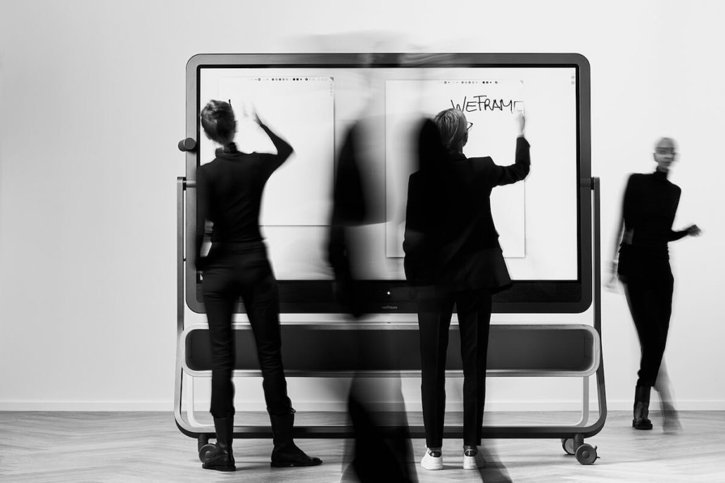 weframe One besteht aus einem 86 Zoll großen 4K-Display mit Multitouch-Board. Dies ermöglicht digitale und interaktive Präsentationen und bindet alle Teilnehmer mit ein, ob vor Ort oder remote via Videocall – ganz einfach per Laptop, Tablet oder Smartphone.
